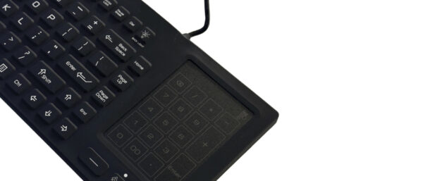 Klawiatura RuggedKEY RSK318-BL to wszechstronna klawiatura biurkowa, która łączy funkcje standardowe z dodatkowymi udogodnieniami, idealna do użytku w środowiskach medycznych. Oferuje 88 silikonowych klawiszy oraz dodatkowe elementy, takie jak wbudowany touchpad i klawiatura numeryczna, co zwiększa jej funkcjonalność. Wymiary 380 mm x 130 mm x 13 mm sprawiają, że jest kompaktowa, a podświetlenie klawiszy ułatwia pracę w słabym oświetleniu.